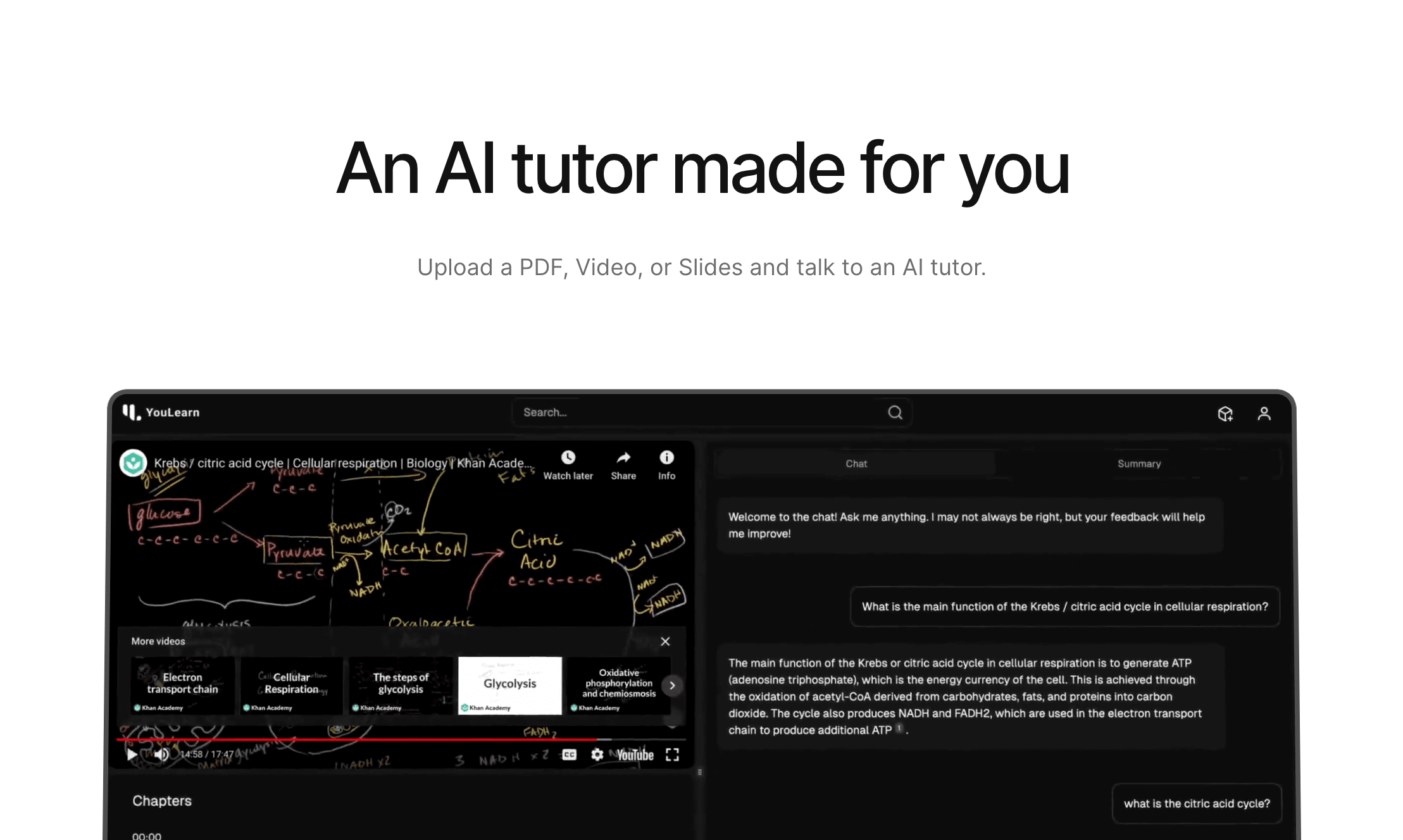 YouLearn AI est une plateforme d'apprentissage alimentée par l'intelligence artificielle qui agit comme un tuteur personnel disponible 24/7. Développée par YouLearn Inc. (Y Combinator Spring 2025), la plateforme transforme des supports passifs (PDFs, vidéos YouTube, présentations, cours enregistrés) en expérience d'apprentissage interactive.